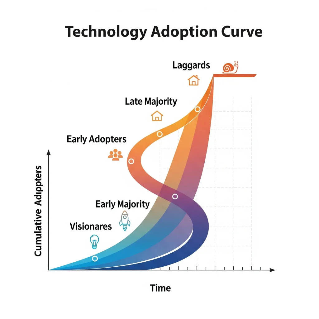 New technologies follow a predictable adoption pattern. First, a small group of visionaries sees the potential long before anyone else. Then, the early adopters join in, eager to try something new. Next, the early majority arrives once the technology proves useful, followed by the late majority who are slower to change. Finally, the laggards adopt it only when they have no choice.